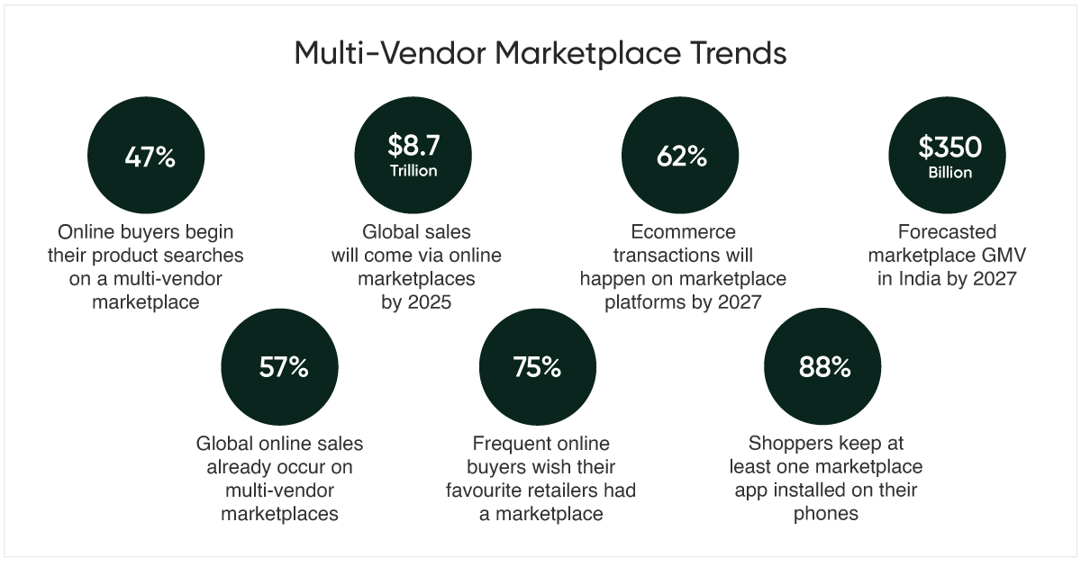 This behaviour is reshaping global digital commerce, transforming it into more of a multi-vendor ecommerce ecosystem. By 2025, marketplaces are expected to drive $8.7 trillion in worldwide sales, and by 2027, 62% of all ecommerce transactions will happen on marketplace platforms. In India, the marketplace economy is projected to hit $350 billion GMV by 2027, reflecting the same global momentum.