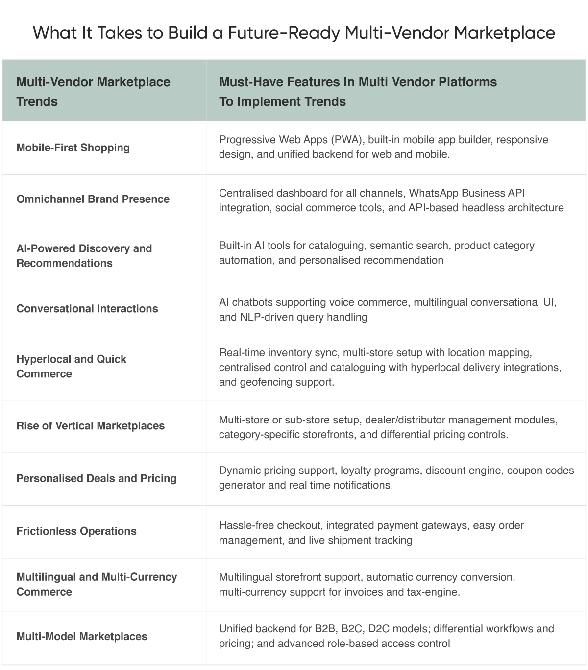 Each ecommerce trend shaping 2026 brings with it a set of technical must-haves. Here’s a quick view of the features enterprises should look for when evaluating multi vendor marketplace platforms.