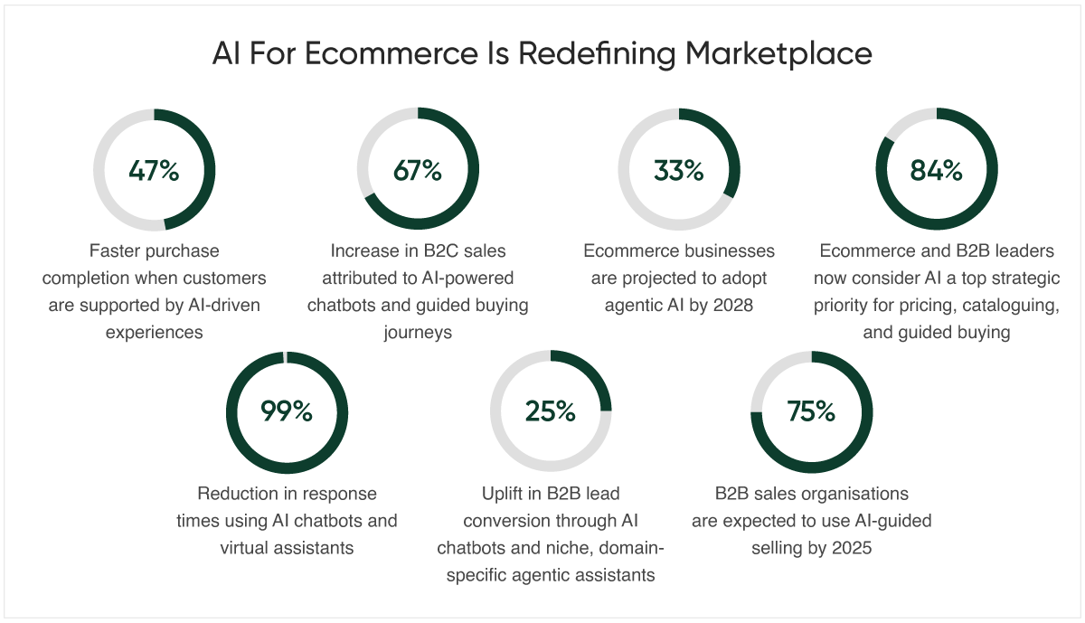 - 67% increase in B2C sales attributed to AI-powered chatbots and guided buying journeys (Source: Digital Commerce 360)