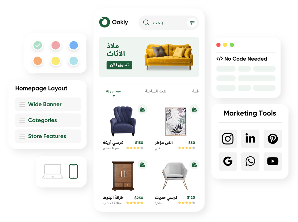 • 100% design and code flexibility to build tailored, multilingual (RTL support) ecommerce solutions